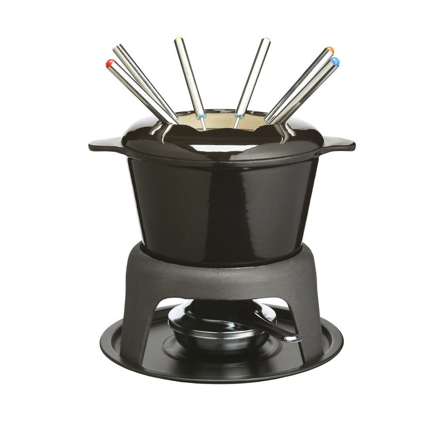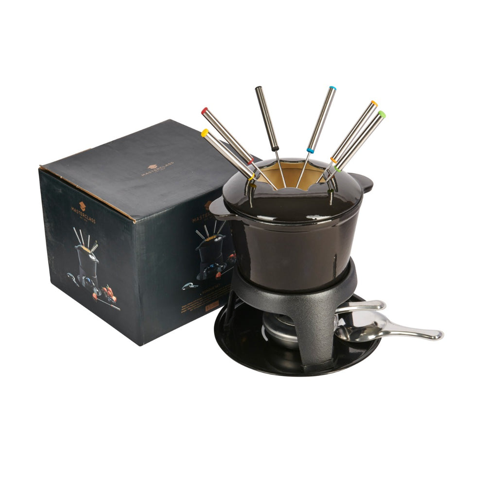 Something to make your guests go "wow"! This slick and stylish fondue set from MasterClass is made from beautiful cast iron and given a captivating black coating. It's perfect for serving cheese, breads, rich chocolate or even savoury broths. The set comes with an adjustable burner which can be used with methylated spirits as well as fondue gel and also contains a snuffer.