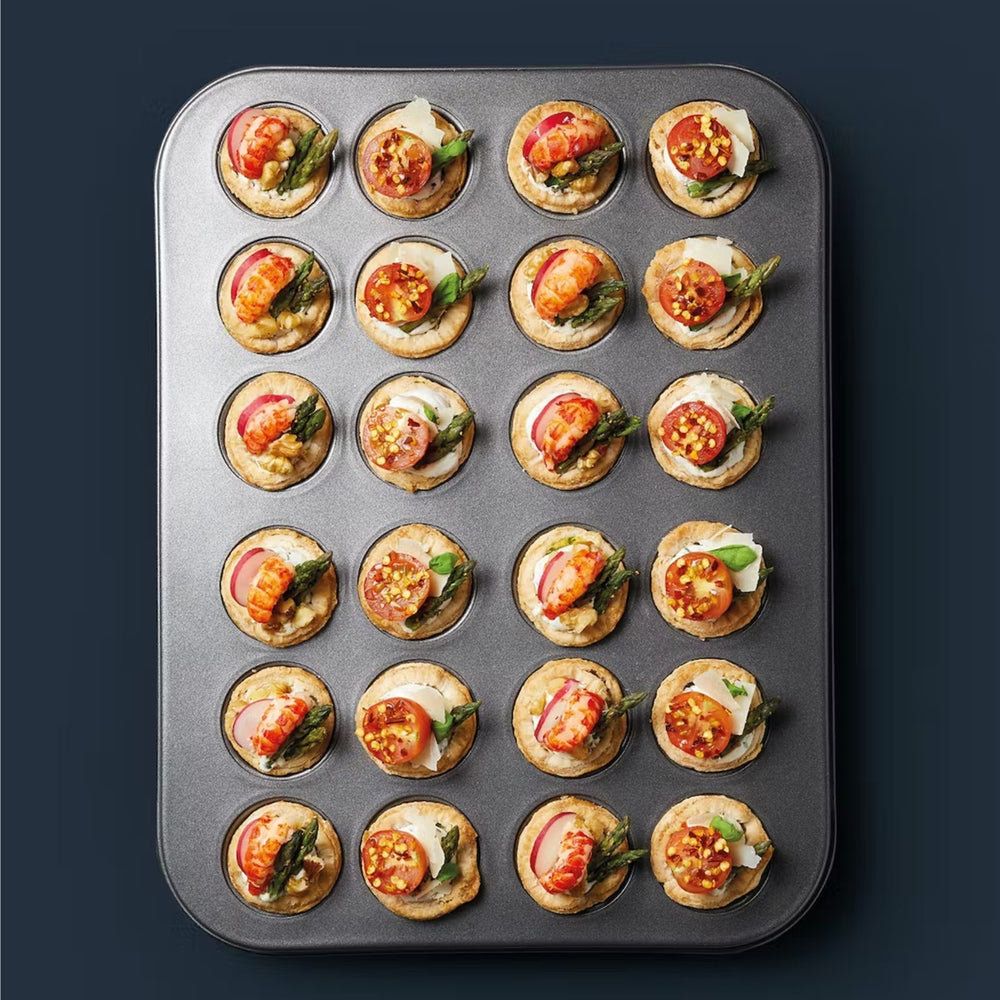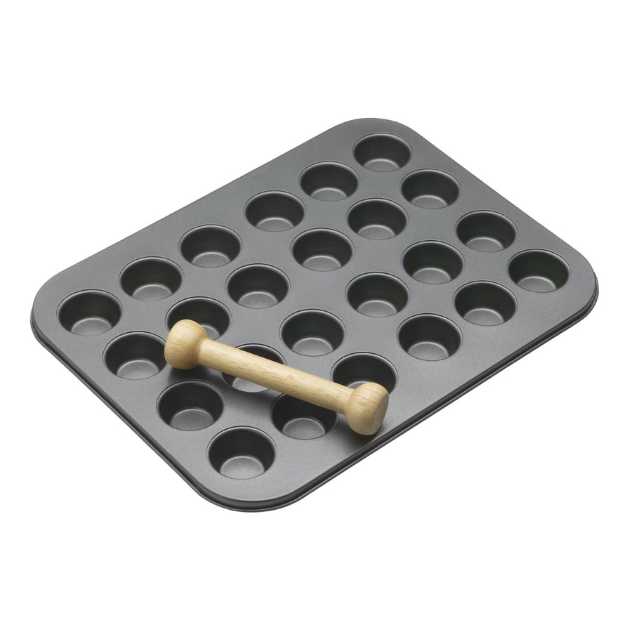 Cook & bake perfectly round mini treats with this specially designed pan! Made from heavy duty carbon steel with a non-stick coating, this tin comes with a wooden plunger to help you push the pastry firmly into the holes. Ideal for creating canapes, mini quiches and tarts to serve at dinner parties!