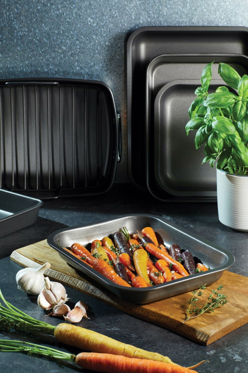 Roast delicious, succulent small joints of meat, poultry or vegetables in this heavy duty open roaster. Made from 1mm steel with a double non-stick coating, this small roaster is dishwasher, oven, fridge & freezer safe!