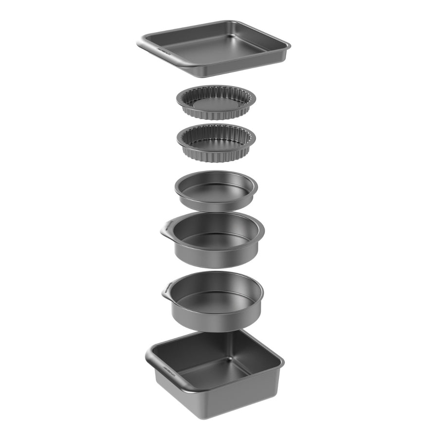 Say goodbye to space-hogging baking trays, and say hello to the Smart Space range from MasterClass! With seven essential tins for baking, roasting and pastry - a roaster, two deep cake tins, one sandwich tin, a quiche tin and more - this revolutionary new range allows you to reclaim your kitchen with style. Each piece nests neatly within the other for easy storage when not in use, making this essential set a must-have in any home.