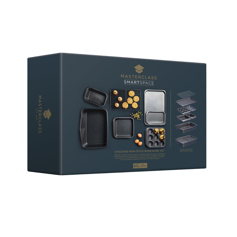 Say goodbye to space-hogging baking trays, and say hello to the Smart Space range from MasterClass! With seven essential tins for baking & roasting - a roaster, loaf tin, cooling rack, baking trays and more - this revolutionary new range allows you to reclaim your kitchen with style. Each piece nests neatly within the other for easy storage when not in use, making this essential set a must-have in any home.