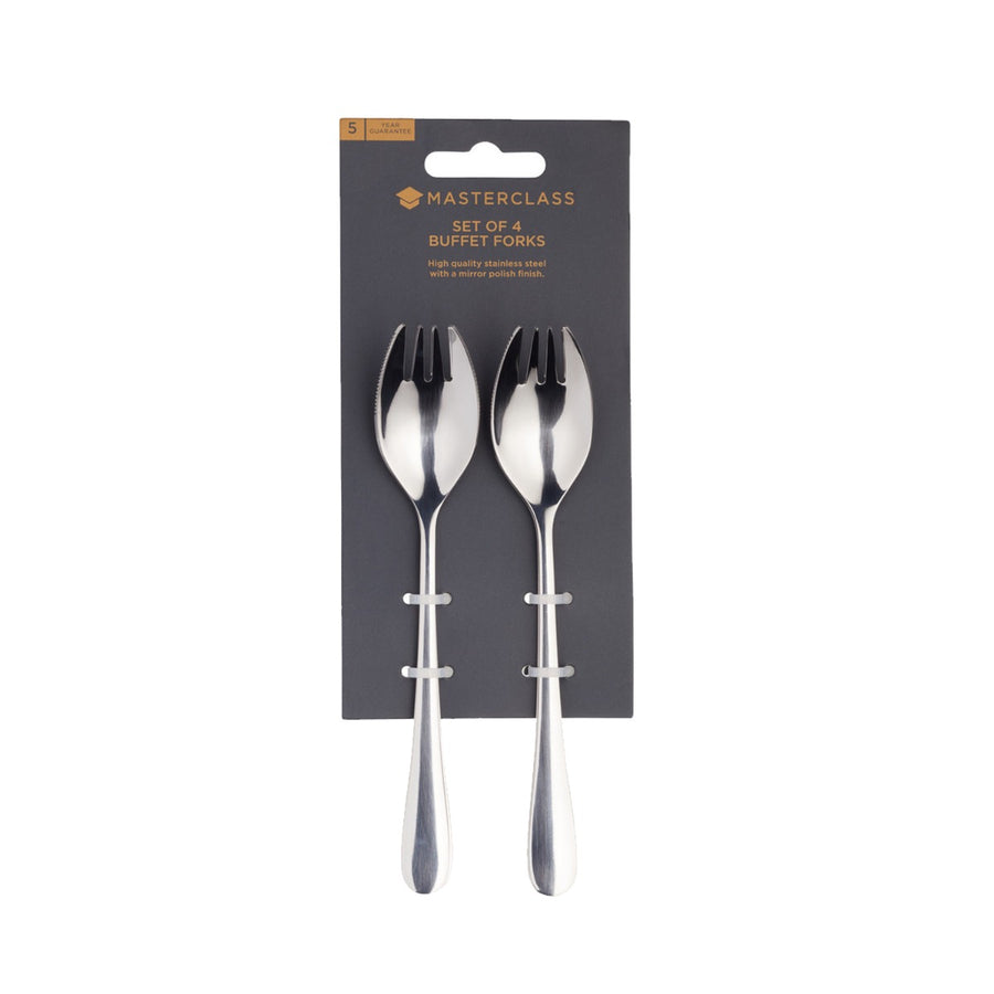 This set of buffet forks are the perfect tools for parties, buffets and eating on-the-go! Made from mirror-finished stainless steel, these utensils are a smart combination of a knife, fork and spoon. Dishwasher safe, these buffet forks are a stylish and versatile addition to your cutlery collection!
