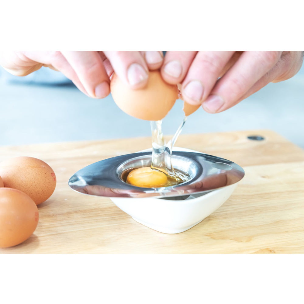 No more fiddly egg shells, and no more messy fingers! This easy-to-use egg separator makes the task of separating egg yolks from their whites super simple. All you need to do is place the separator over the top of a mug, dish or tumbler, then crack your egg into the angled bowl. The bowl of the separator will catch the egg yolk, while its perforations allow the egg white to collect in the receptacle beneath.