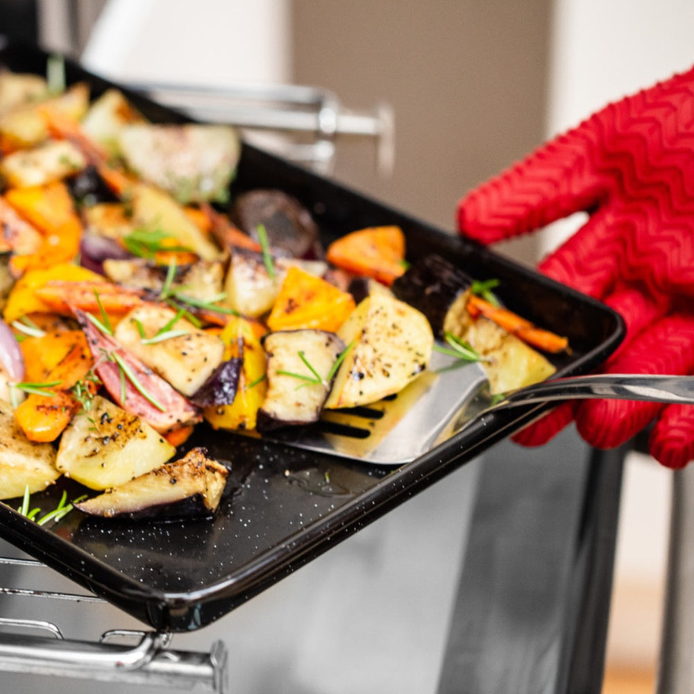 Ideal for those kitchen connoisseurs among us - this sturdy small baking tray from MasterClass is ideal for baking cookies, vegetables and smaller portions! Manufactured from heavy duty 1mm steel with a durable enamel coating, this tray is suitable for use on all heat sources - including induction! Dishwasher, oven, fridge and freezer safe, you can even use metal utensils without fear of damage.