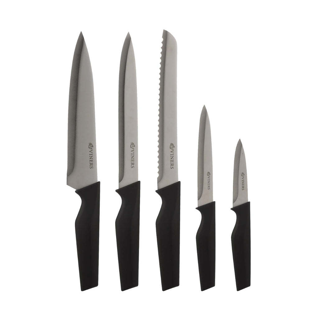 Contains: 1 x Chef's Knife, 1 x Bread Knife, 1 x Carving Knife, 1 x Utility Knife, 1 x Paring Knife, 1 x Knife Block.