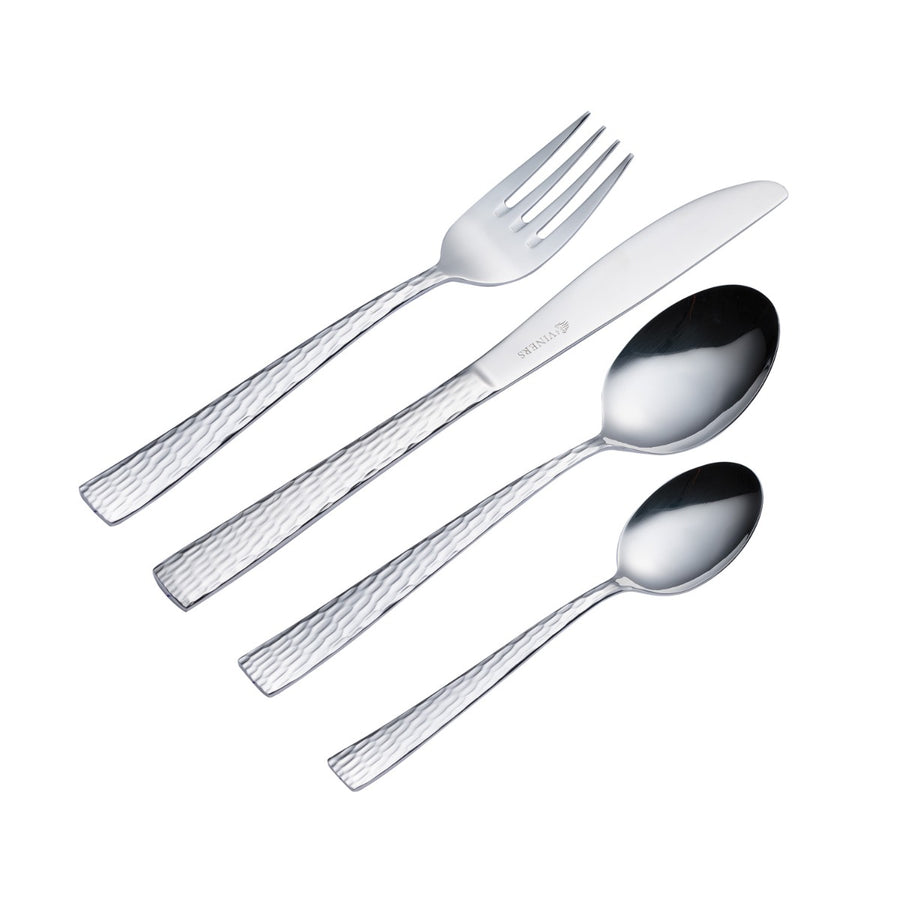 Add that dazzling finishing touch to any table setting with the Glisten collection from Viners! This set is perfect for everyday use and when entertaining guests. Made from the finest 18/0 quality steel, the 16-piece set has hammered textured handles and a mirror polish finish.