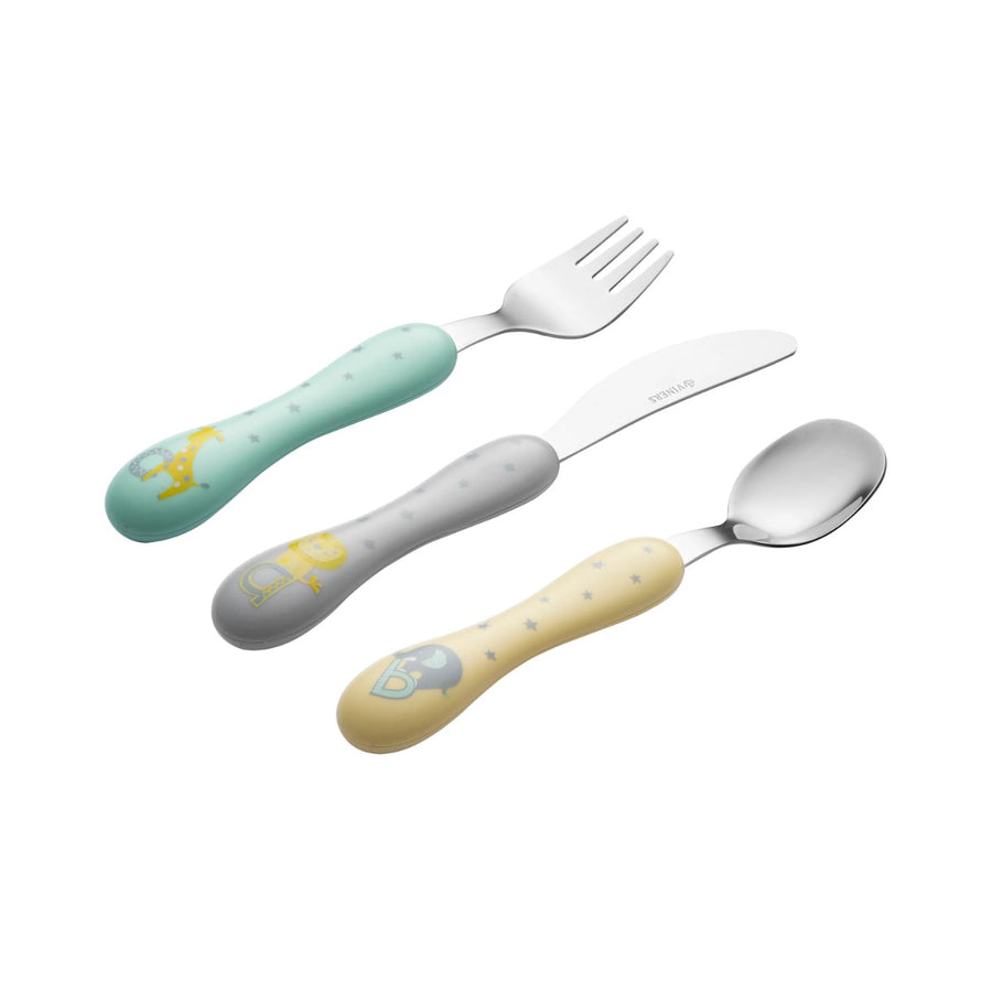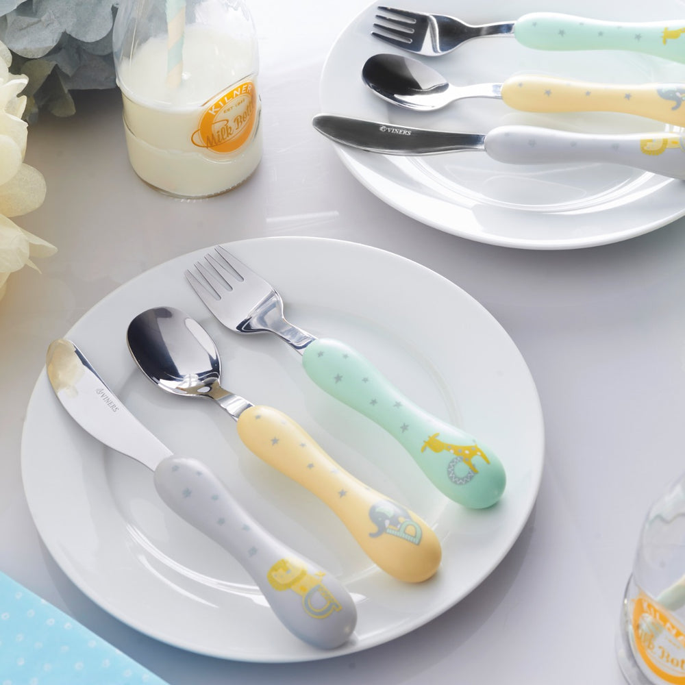 Designed to help your child learn and develop! Made from 18/0 stainless steel with easy-grip plastic handles, this set of three toddler's cutlery features a fun pastel colour scheme, with a scattered star print and giraffe/elephant/lion design.