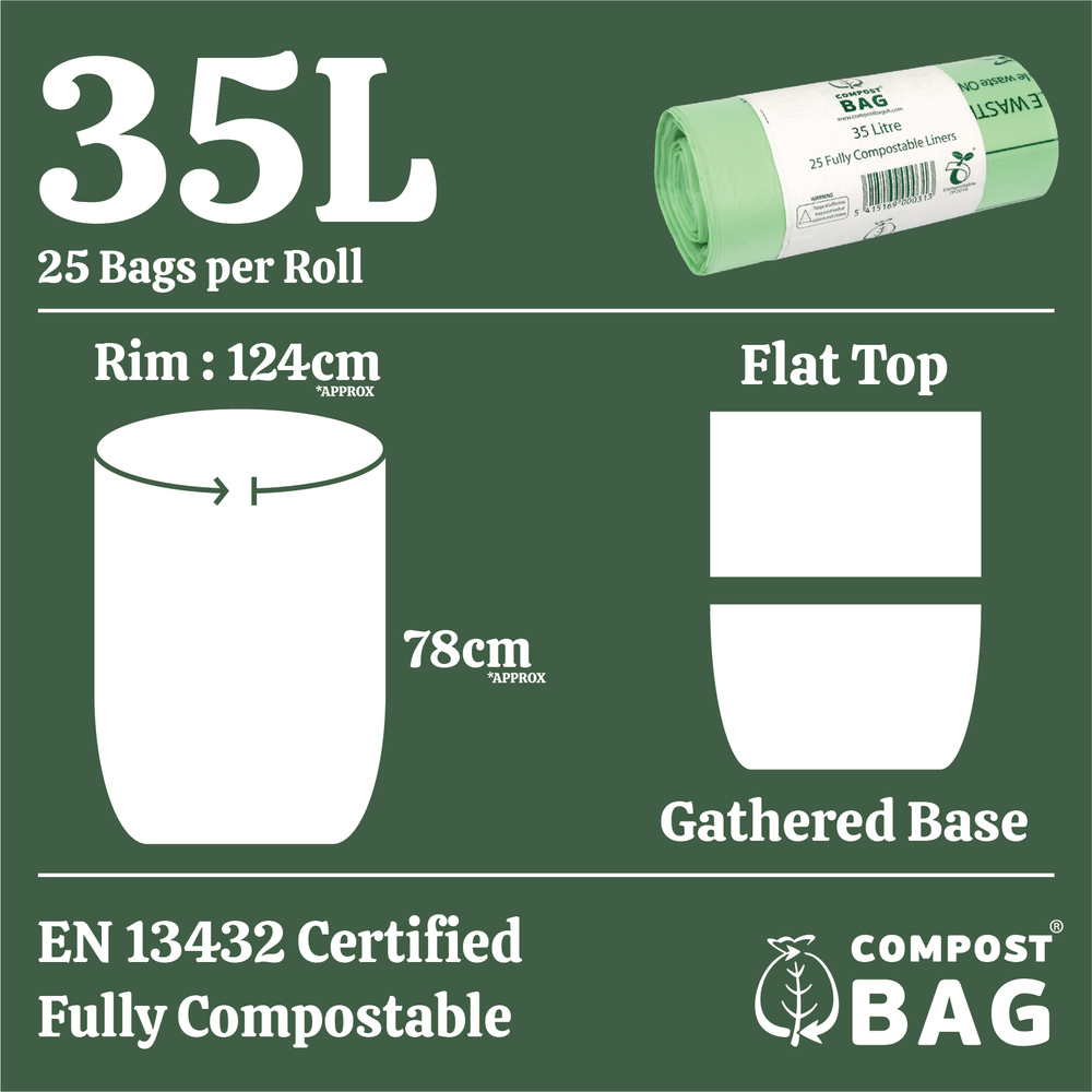 Environmentally friendly, fully compostable (EN13432) and biodegradable, Compost Bag brand liners are the perfect fit! Supplied in rolls of 25 bags per roll, using a compostable liner makes it easy to keep your caddy/bin clean, whilst doing your bit for the environment at the same time! These bags feature a "star-sealed" base, whereby the base of the bag is gathered and sealed in such a way as to provide extra strength. This helps to prevent the bag breaking when full of food waste, but does not affect the overall capacity of the bag.