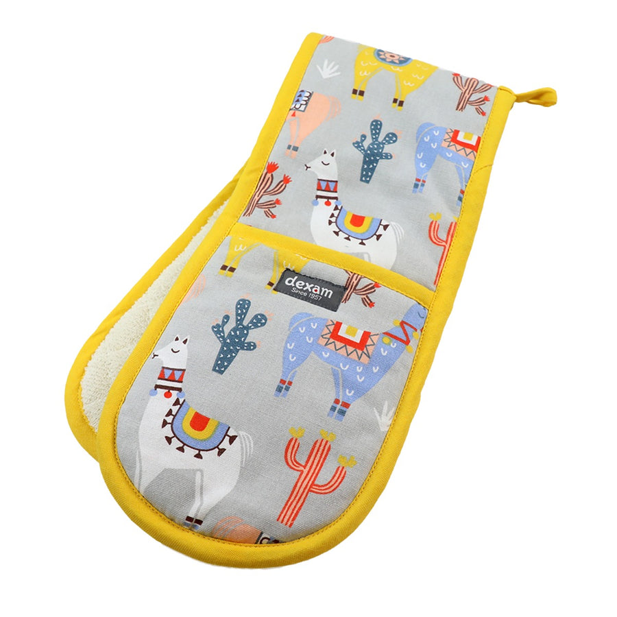 This bright and colourful patterned double oven glove from Dexam features a funky print filled with Llama's and desert themed plants across a grey background. The ideal gift for any keen baker or cook who loves trying exotic recipes - or who adores llamas!