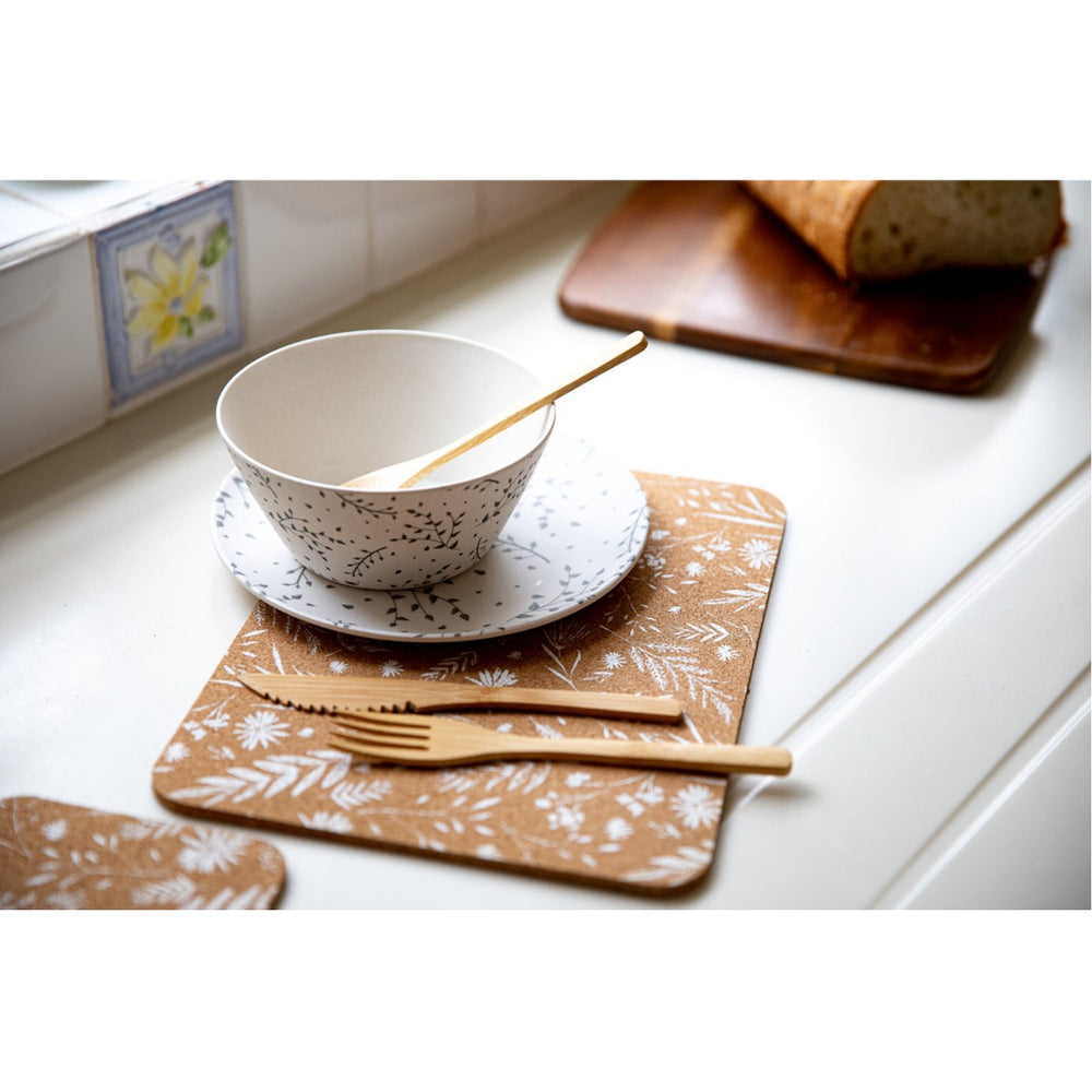 Bring happy, natural vibes to your dining room with this set of four cork placemats. Featuring a pretty, white floral print, the high quality cork placemats are not only eco-friendly, but they will also bring the beauty of outdoors into your home, whilst protecting surfaces from hot plates, bowls and pans.