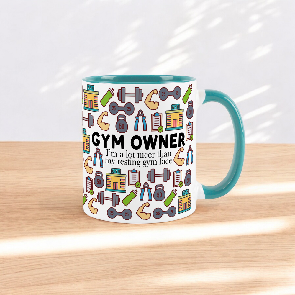 This gym owner-themed mug is a perfect gift for the exercise fanatic in your life! Featuring a print filled with weights and other gym equipment all around the mug and the text "Gym Owner - I'm a lot nicer than my resting gym face" on the front, this will be sure to make their hot drinks taste even better while they work!